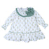Vestido de niña con cuello volante en fondo blanco con estampado de ositos en tonos verdes y beiges . Lazada en bambula verde en el cuello .
