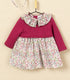Vestido de bebé niña confeccionado en cuerpo acolchado color buganvilla y falda de vuelo en estampado floral. El diseño se completa con un coqueto cuello volante en el mismo tejido floral, ribeteado con vivo en contraste que realza el conjunto. Una prenda dulce y cómoda, ideal para las ocasiones más especiales de la temporada..