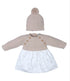 Conjunto ideal para bebé compuesto por un vestido de manga larga con cuerpo de punto en color piedra y falda de algodón con delicado estampado. Los botones delanteros de madera y los acabados de punto en puños y cintura aportan un estilo clásico y elegante. Incluye gorro de punto a juego con borla, perfecto para mantener al bebé abrigado y con un look encantador en los días más frescos.