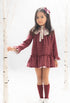 Vestido de niña en cuadro vichy burdeos con falda de volante y manga larga acabada en pequeños volantes. El detalle protagonista es su cuello babero en estampado floral con gran lazada central, que además es desmontable, permitiendo dos estilos diferentes en una misma prenda. Un diseño versátil, cómodo y con mucho encanto para cualquier ocasión.