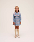 Vestido de niña evasé azul de rayas naranja y blanco, cuello con volante con ribete, manga larga, forro interior y cierre delantero con botones de madera..