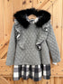 Vestido de niña con diseño de sudadera incorporada en tejido acolchado gris y falda de cuadros grandes en blanco, negro y gris. Destaca por sus volantes decorativos en las mangas y su capucha con pelo negro suave, que aporta abrigo y un aire sofisticado. Una prenda única, cómoda y cálida.