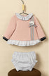Ternura y elegancia en su máxima expresión. Este conjunto de dos piezas está formado por una blusa en punto rosa empolvado con cuello y bajo rematados en volantes gris perla con topitos blancos. Detalle de lazo decorativo con cinta bicolor y pequeño osito bordado que aporta un toque dulce y original. 0025580