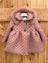 Abrigo ideal para niña confeccionado en tejido acolchado con topitos en relieve, en un elegante tono rosa empolvado. El diseño destaca por su cuello con volante y detalle de pelo suave a tono, además de capucha integrada para mayor protección.