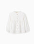 Camisa blanca de niña de manga larga con textura. Volantes en el cuello y pespuntes fruncidos en el pecho. Mangas ligeramente acampanadas con puños elásticos ondulados. Botones coco. Corte acampanado. Una prenda clave en tu armario. 310752 zippy