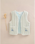 Chaleco de niña verde con flor bordada en bolsillos y ribete blanco con estampado de hojas y  textura acolchada, cálido y estiloso para cualquier ocasión. N72