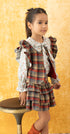 Conjunto de tres piezas compuesto por camisa de manga larga en estampado floral con cuello babero y lazada, falda de cuadros con doble volante y chaleco a juego en tejido tartán. La camisa destaca por sus volantes en los hombros y puños engomados, mientras que el chaleco añade un toque elegante y sofisticado. Un look ideal para otoño-invierno que combina romanticismo y estilo clásico.