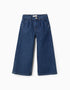 Vaqueros azul oscuro para niña, modelo de pernera ancha. 100 % algodón. Cuatro bolsillos. Cintura interior ajustable con elásticos y botones. Big Me: se abrocha con un botón a presión bajo un botón decorativo hasta la talla 8/9, para facilitar el vestido y favorecer la autonomía de tu hija. 31075145 zippy