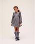 Vestido de niña evasé gris con corazones granates de terciopelo, manga larga, puño elástico, volantes laterales y lazo granate en espalda y cierre trasero. N125
