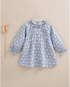 Vestido de bebé niña de corte evasé azul cielo con estampado de hojas, manga larga, cuello con volante fruncido y cierre trasero con botones. N74
